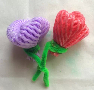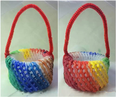 较大的水果网套对折后把中心扎紧,配上毛根就是一个小花篮,可以刷成五彩花篮。