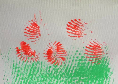 用水果网套沾颜料进行涂画拓印。