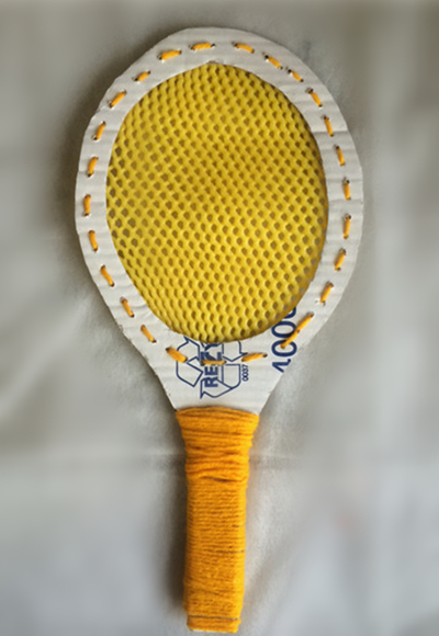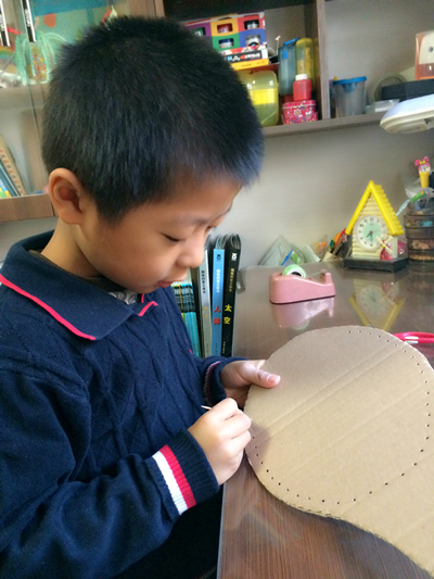 硬纸板剪出球拍形状,中间挖空,用牙签打孔。