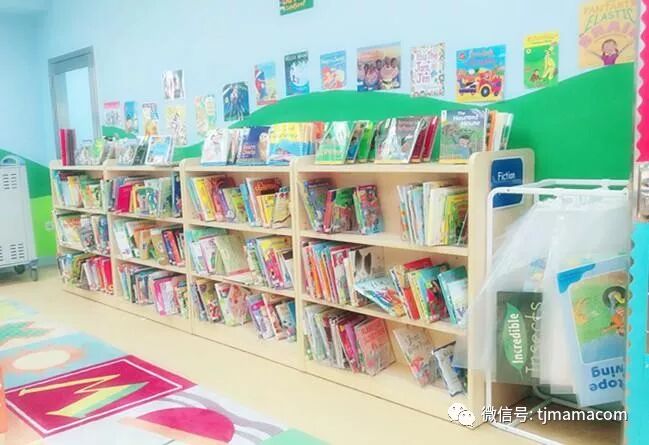 中英文图书分开两边摆放,小朋友喜欢的图书,家长可以借阅,带回家享受亲子阅读时光。